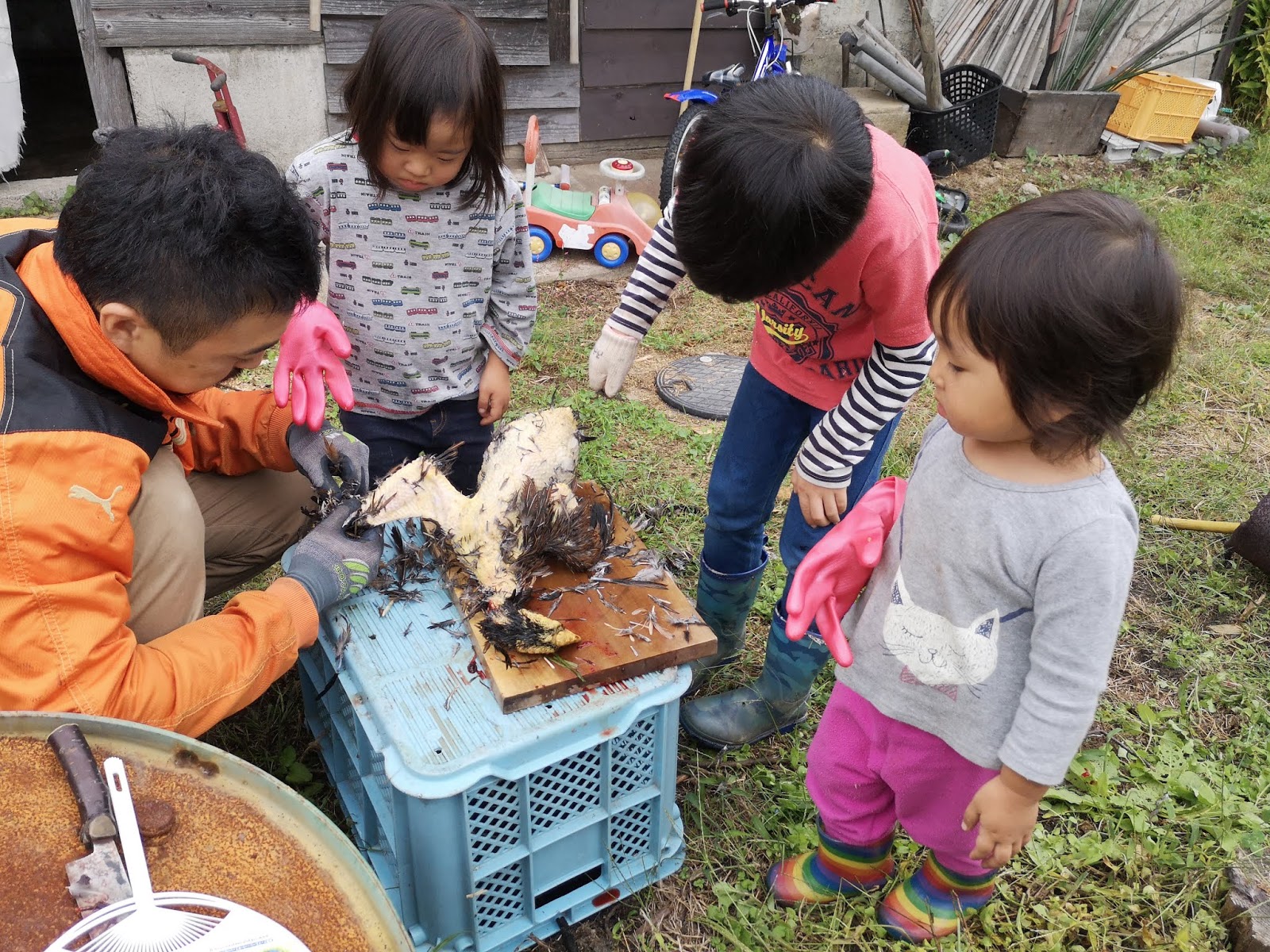 絶命して、熱湯につけて羽をむしる段階になると、楓ちゃんも落ち着いて参加しました。