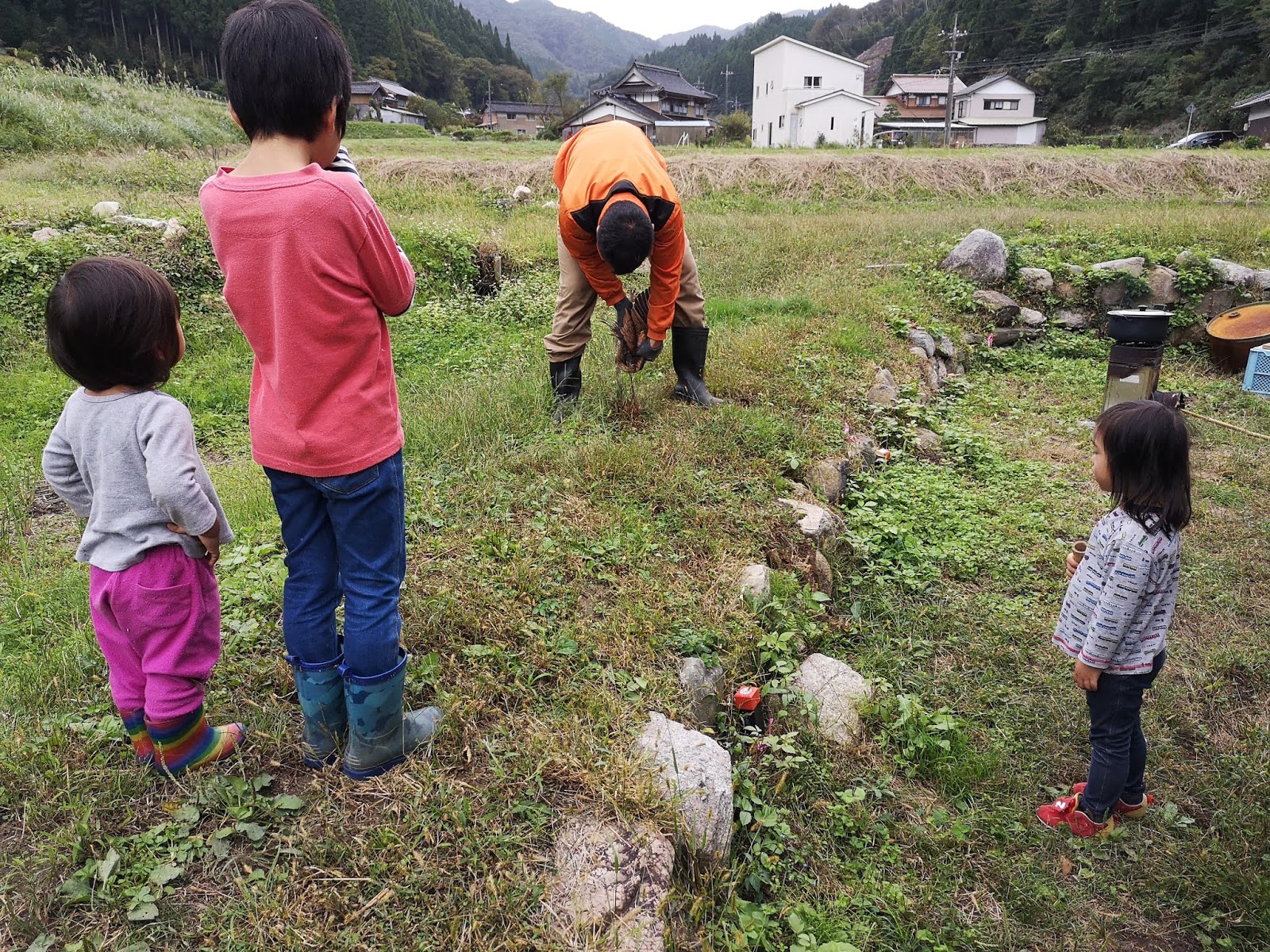 秋祭りが終わっての休日、畑のサツマイモを家族で収穫した。