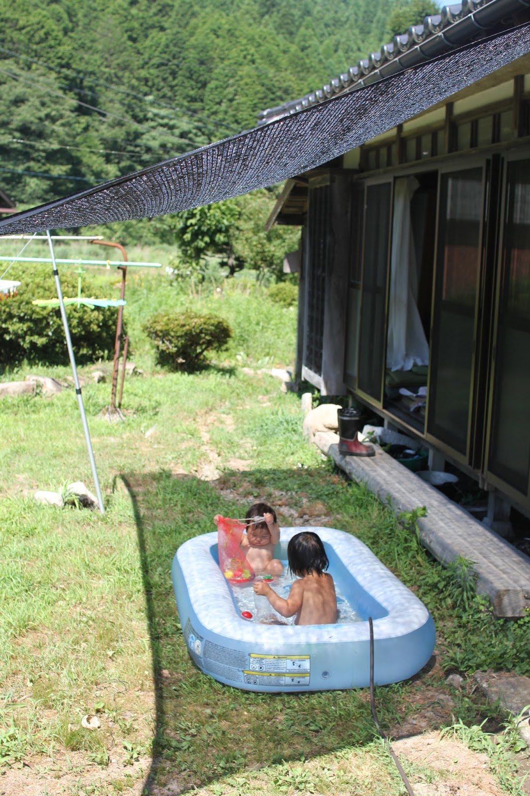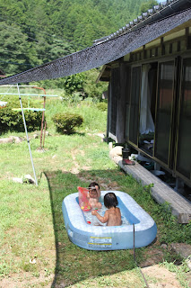 我が家にはクーラーがありませんので、日中暑いと近くの川へ遊びに行ったり、庭にプールを出して涼みます。