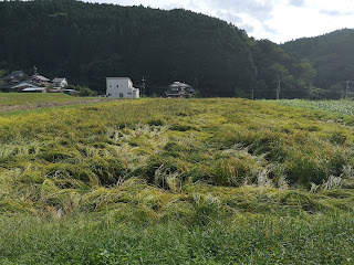 何年もお米を作っていなかった田んぼだったので、とてもよく肥えていて、実りすぎて稲がたくさん倒れてしまいました。