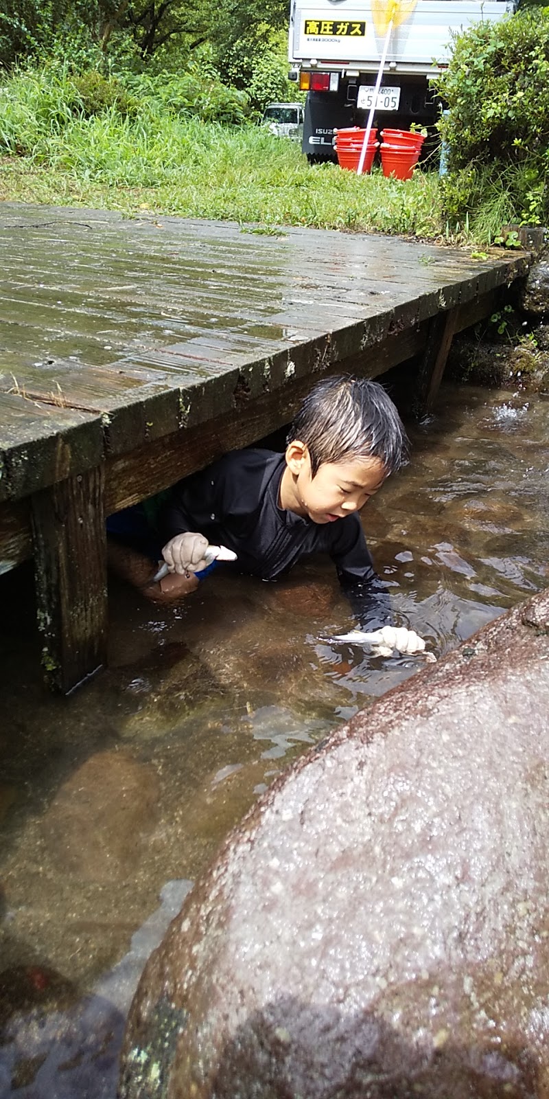 橋の下に潜っては、両手に鮎を掴んで出てきます。