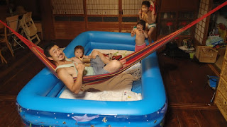 我が家にはクーラーがありませんので、日中暑いと近くの川へ遊びに行ったり、庭にプールを出して涼みます。