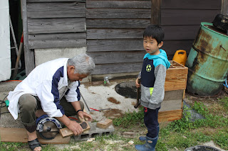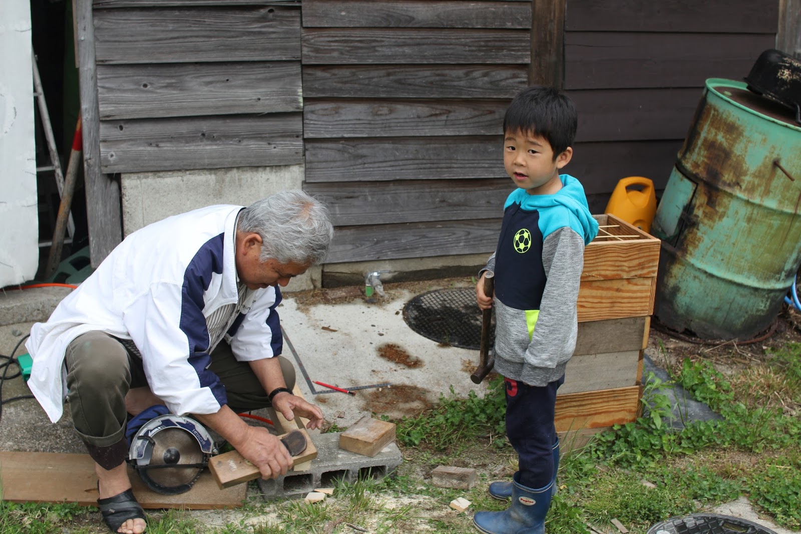 「よし!やろう!」とじぃじも乗ってくれて、二段ベッドの上段に上がるための階段を裏の納屋から材料を取り出してきて一緒に作ってくれました。
