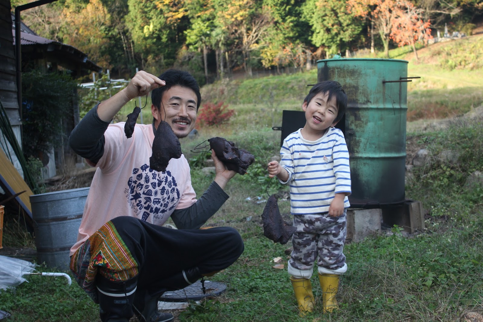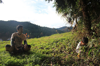 一生懸命摘む息子を見守る父