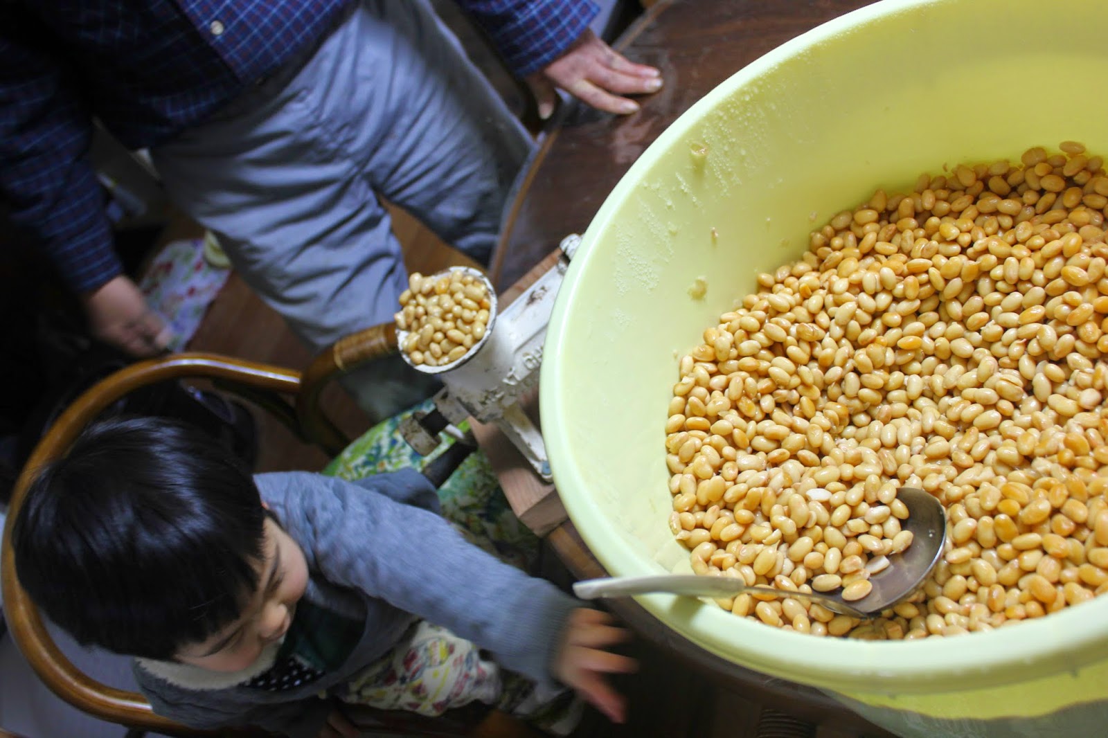 日々の暮らし みそ 2015年2月27日 / この前の火曜日 恒例のみそ作りをしました。 年末から何かとバタバタしていましたが、無事味噌作りすることが出来ました。 今年の大豆のうち50%(2.5kg)は自家製の大豆を使うことが出来ました。 来年の味噌作りは、 豆 コメ 麹菌 を自給出来たらなと思います。 どの程度、自給率をあげられるかな。 大人も一緒に大豆をミンチにしたり、コネコネしたりするのが面白かったようで、息子もずっと一緒に味噌作りを楽しんでいました。 また味噌が出来るのが楽しみですね。